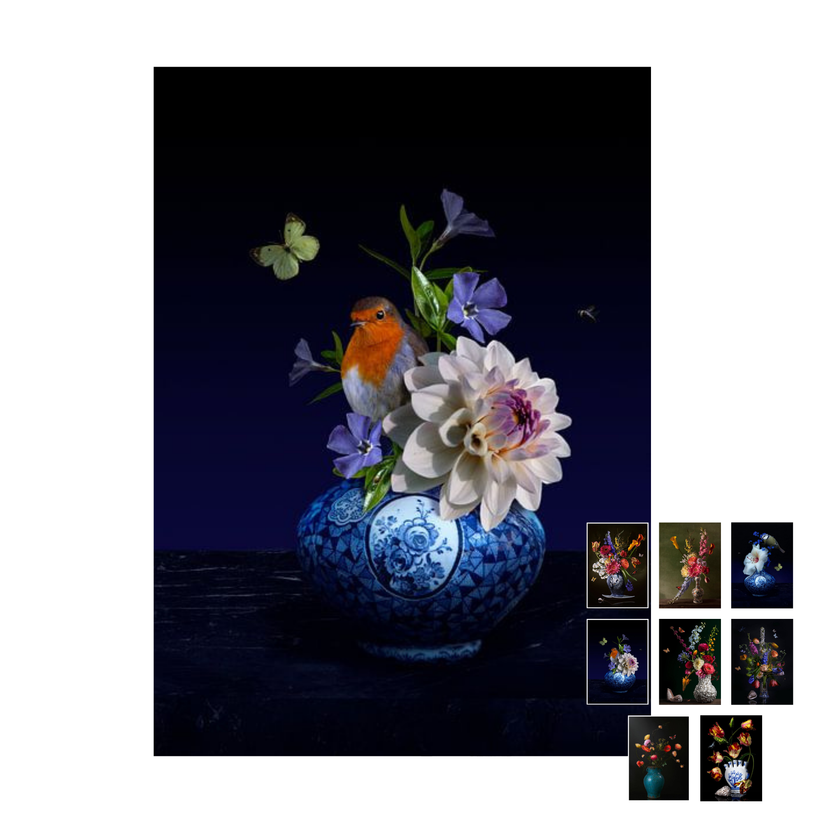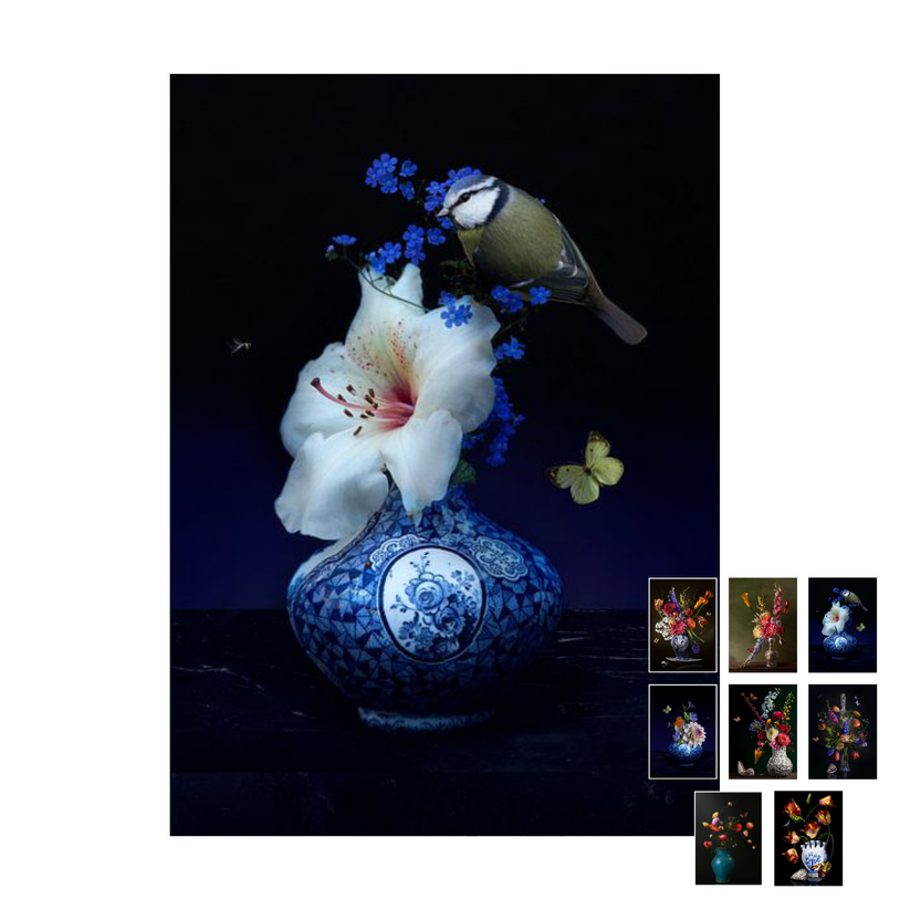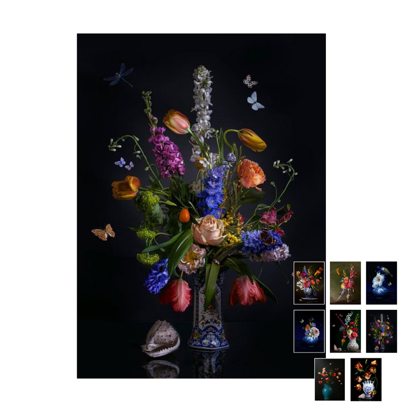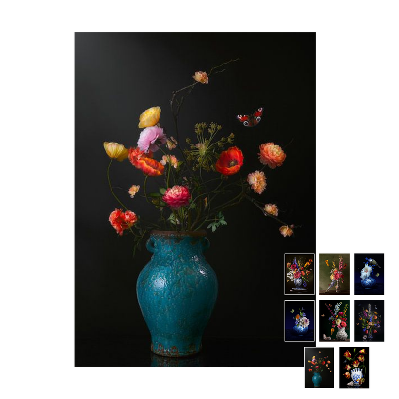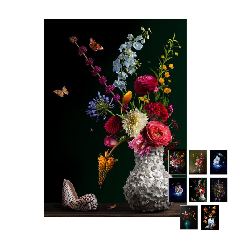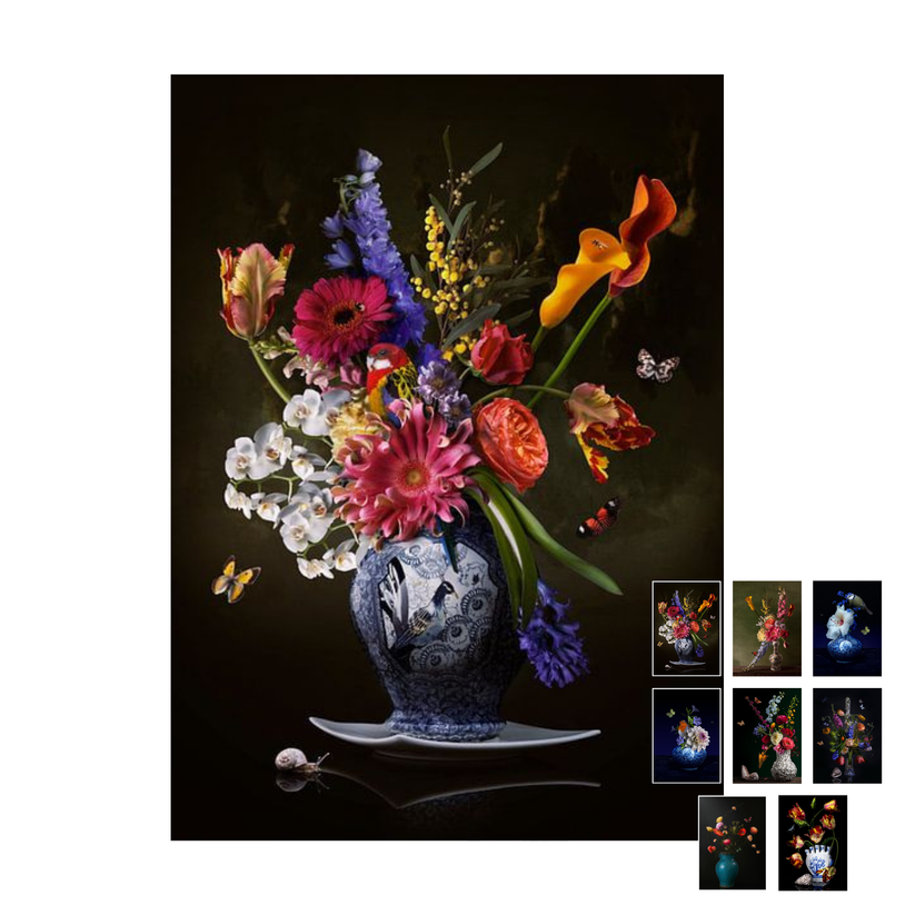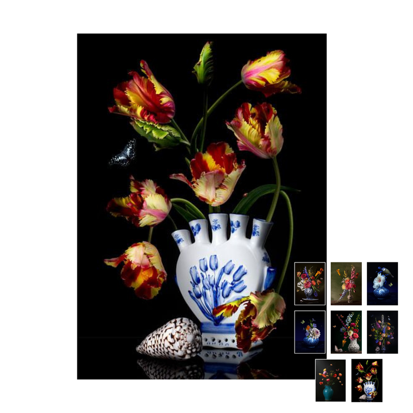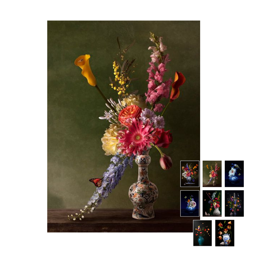 Wij maken gebruik van 300 grams premium museumkwaliteit papier. Dit zorgt niet alleen voor een luxe gevoel, maar garandeert ook dat de kleuren van de bloemstillevens decennialang mooi blijven, zelfs als u ze besluit in te lijsten.
